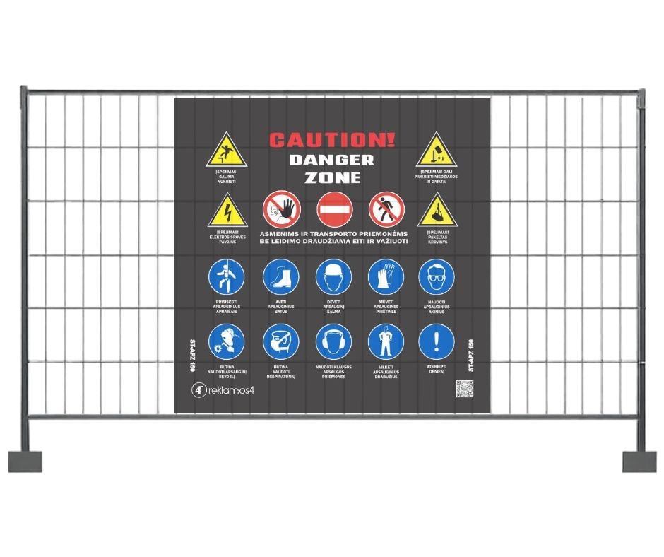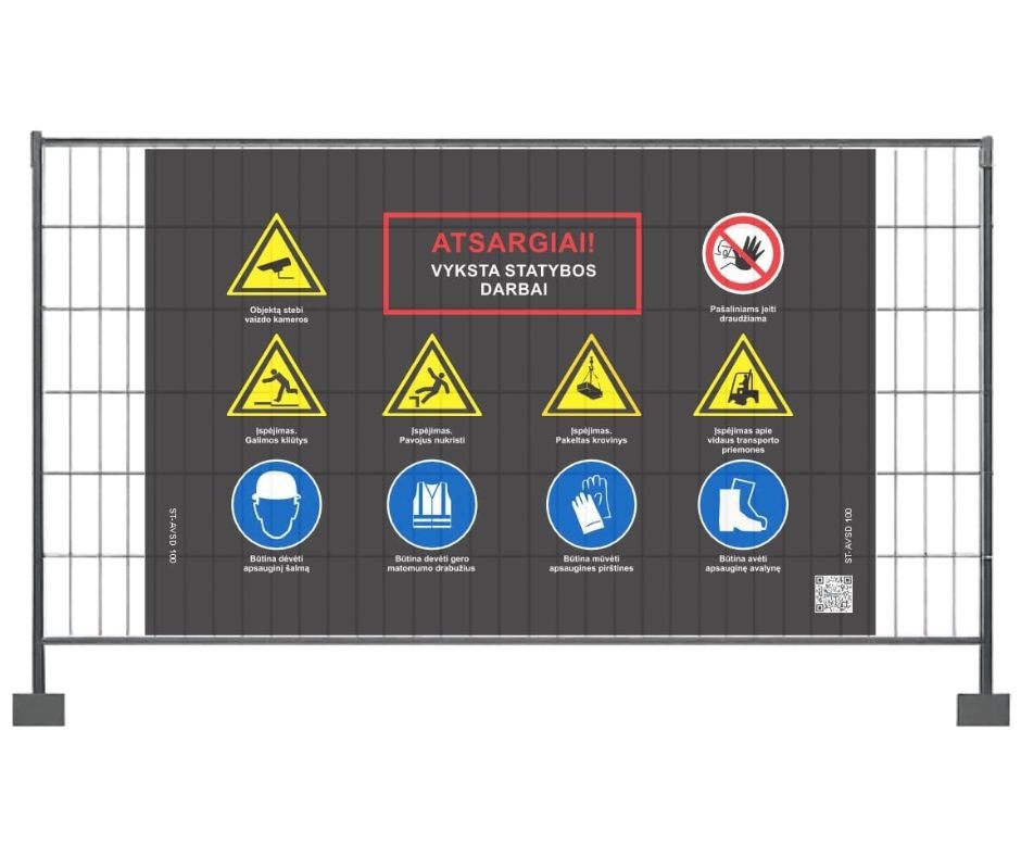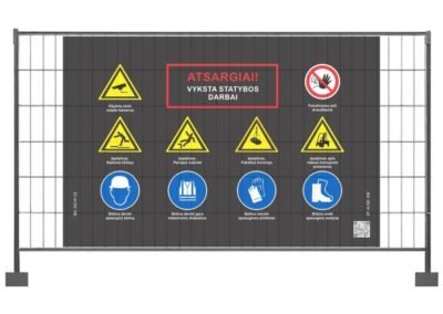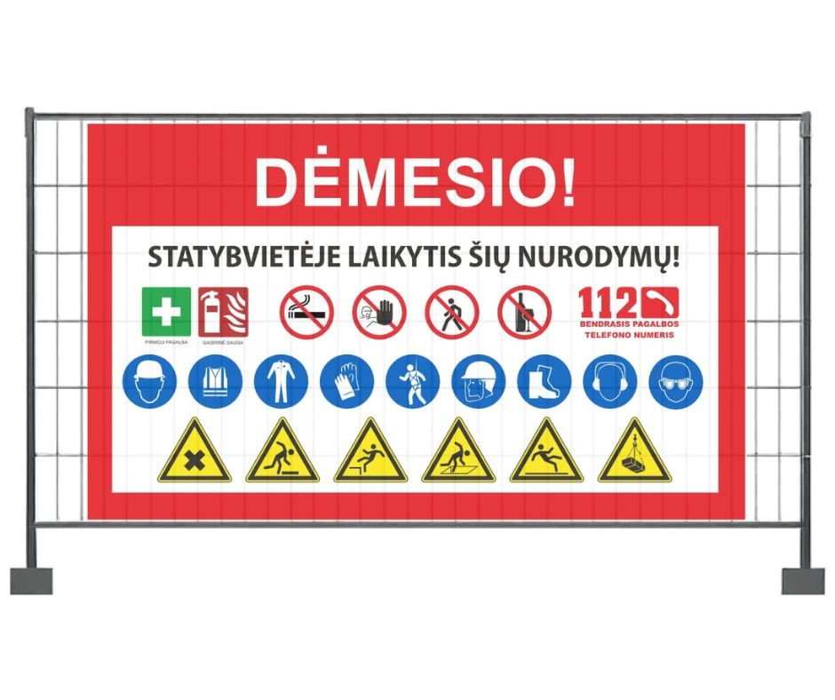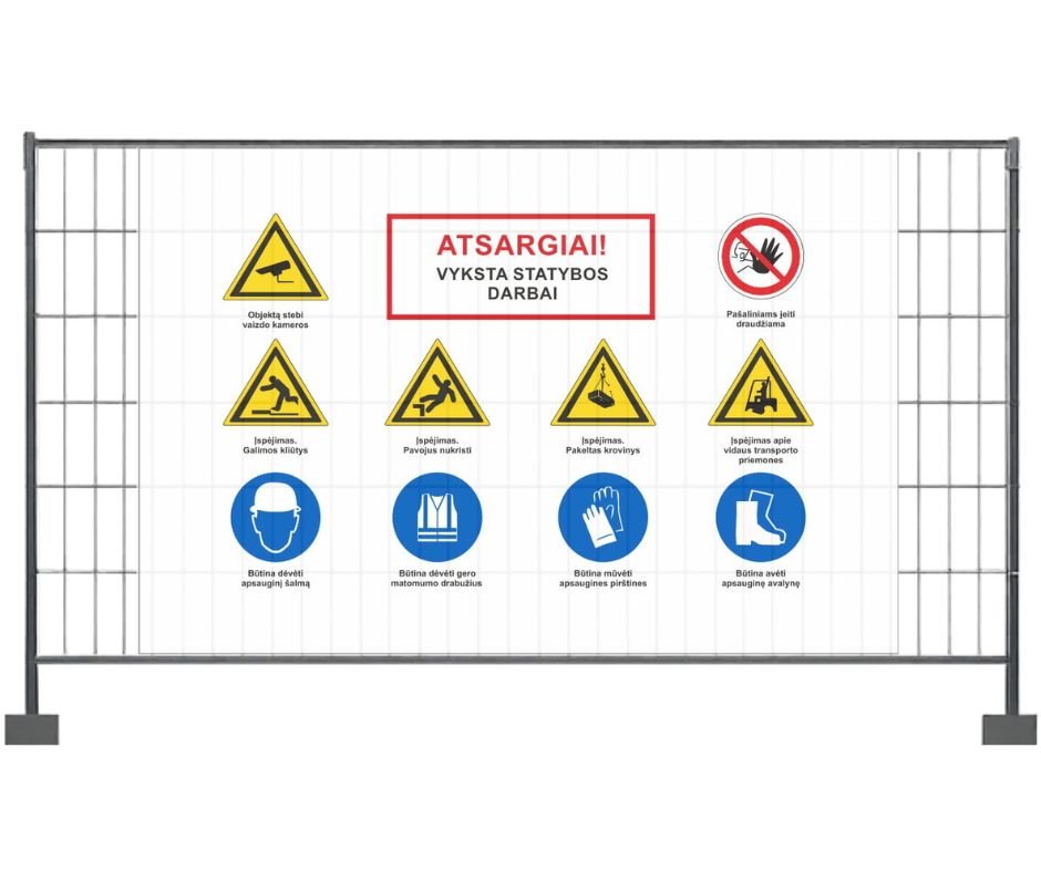 Siūlome visus STR reglamentuojamus variantus – nuo pavojingos zonos ženklinimo iki privalomų nurodymų tentų – su gamyba iki 2 darbo dienų ir pristatymu tiesiai į statybvietę.