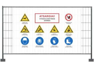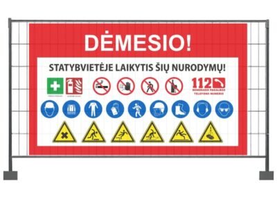 Statybviečių informaciniai stendai, perspėjantys stendai, įspėjamieji stendai, tentai.