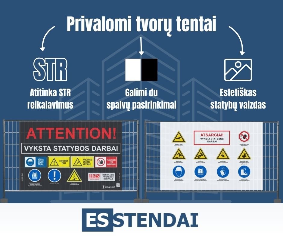 Pagal Lietuvos Respublikos socialinės apsaugos ir darbo ministrės įsakymą Nr. 95, privalomas statybvietės ženklas turi būti įrengtas visur, kur neįmanoma išvengti rizikos kolektyvinėmis saugos priemonėmis. Saugos tentas statybvietėms – paprasčiausias būdas šį reikalavimą įvykdyti: statybvietės tentas kabinamas ant tvoros segmentų ir iš karto informuoja darbuotojus bei praeivius apie vykstančius darbus ir galimus pavojus.