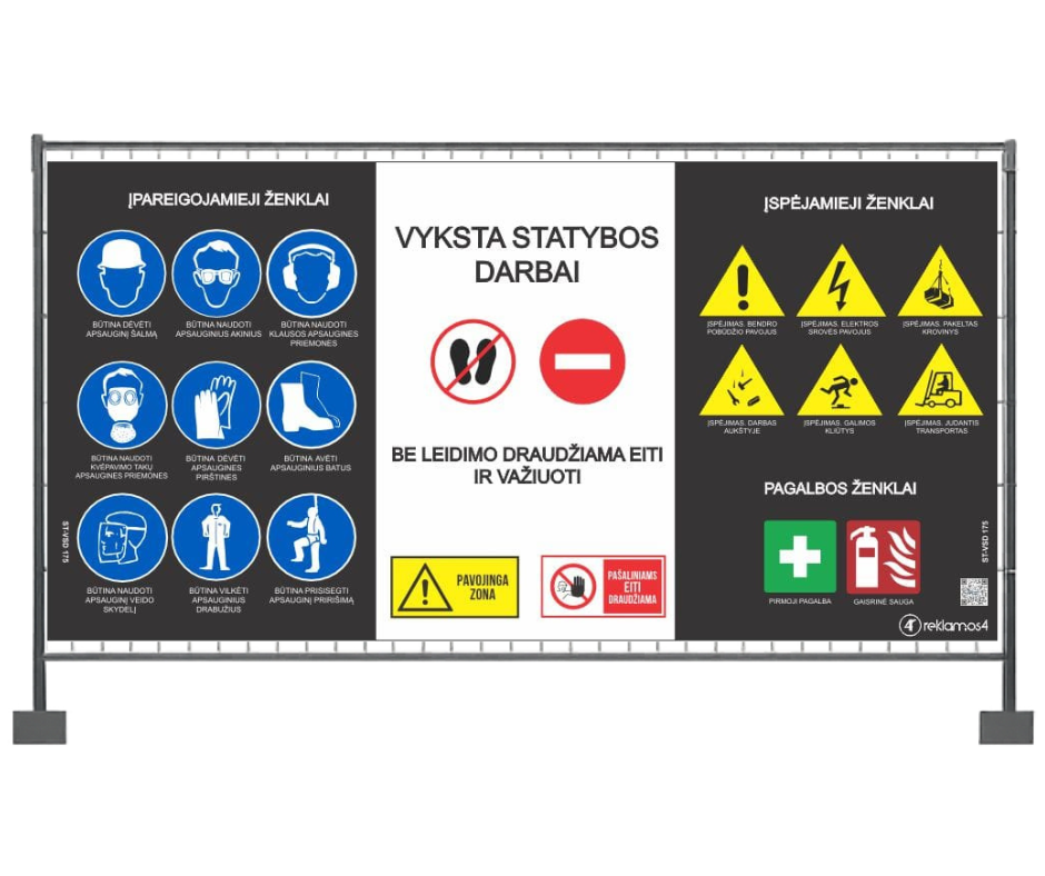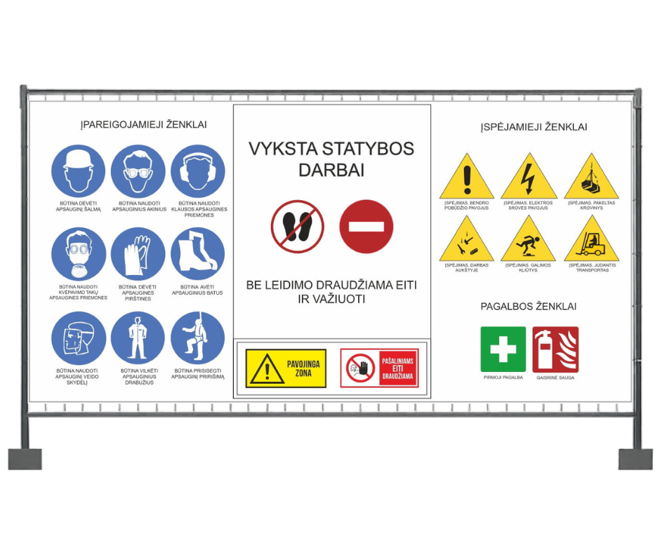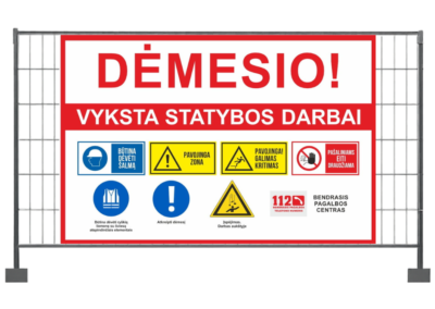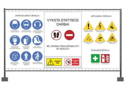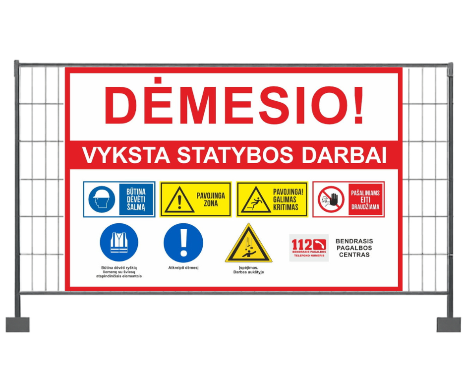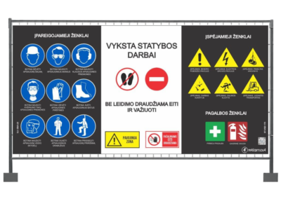 Statybų tvoros tentas su saugos ženklais apsaugo jus nuo teisinės atsakomybės ir parodo, kad statybvietėje dirba profesionali komanda.