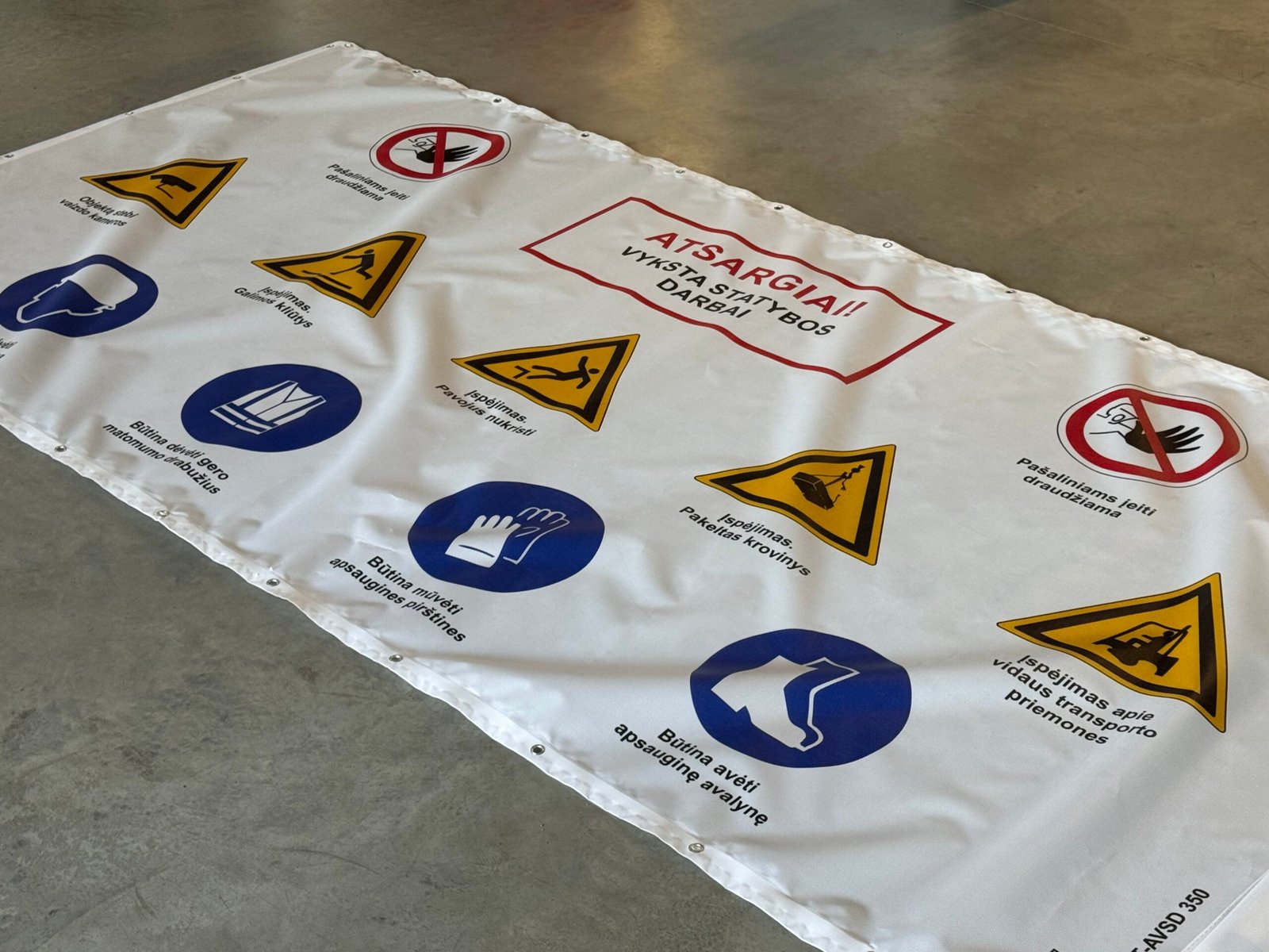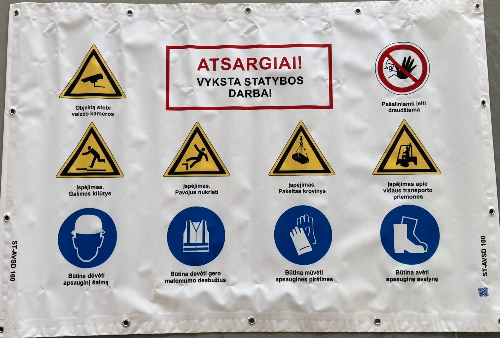 „Atsargiai – Vyksta statybos darbai” (II variantas) — statybvietės tentas alternatyviu dizainu Kodai: ST-BSST100 / ST-BSST175 / ST-BSST350 | Dydžiai: 1500×1000 mm / 2500×1750 mm / 3500×1750 mm